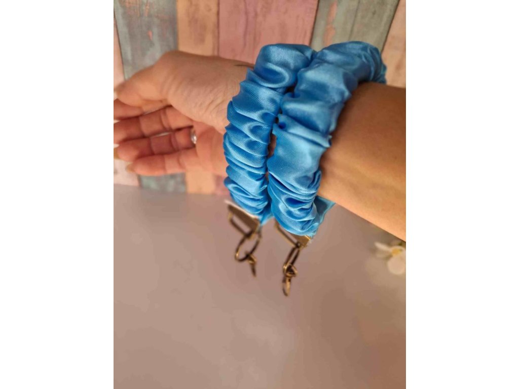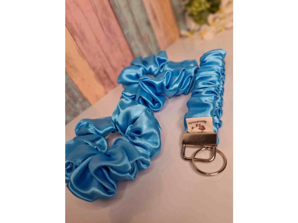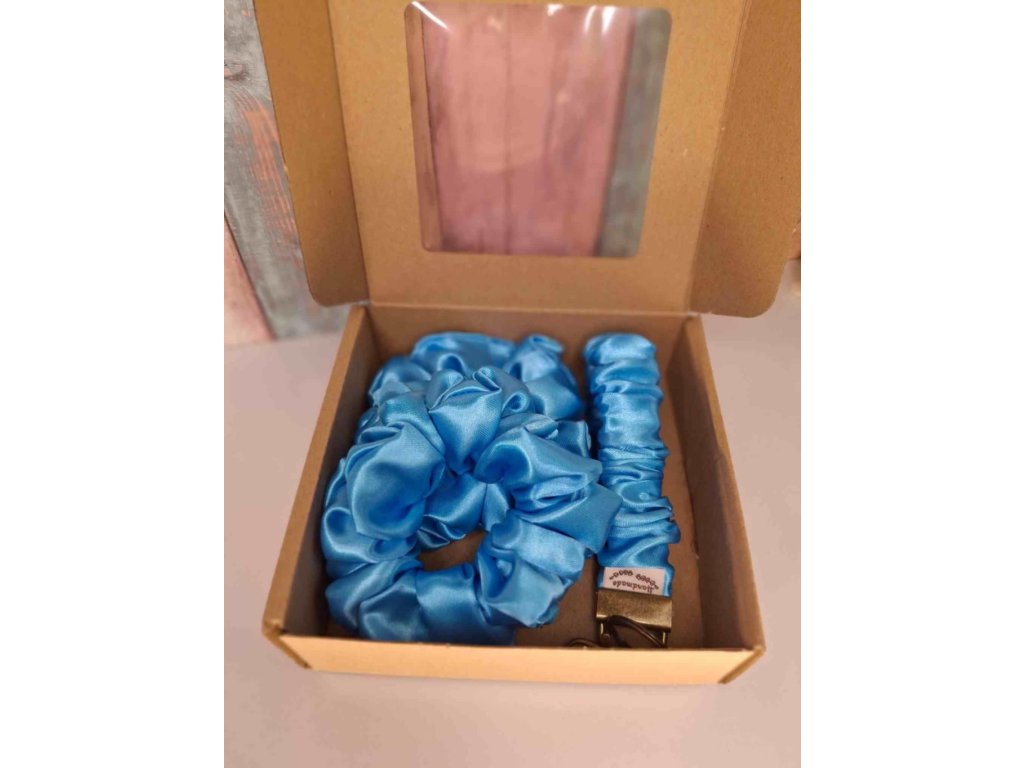 Sada obsahuje dvě saténové scrunchie doplněné o saténovou klíčenku v bledě modré barvě