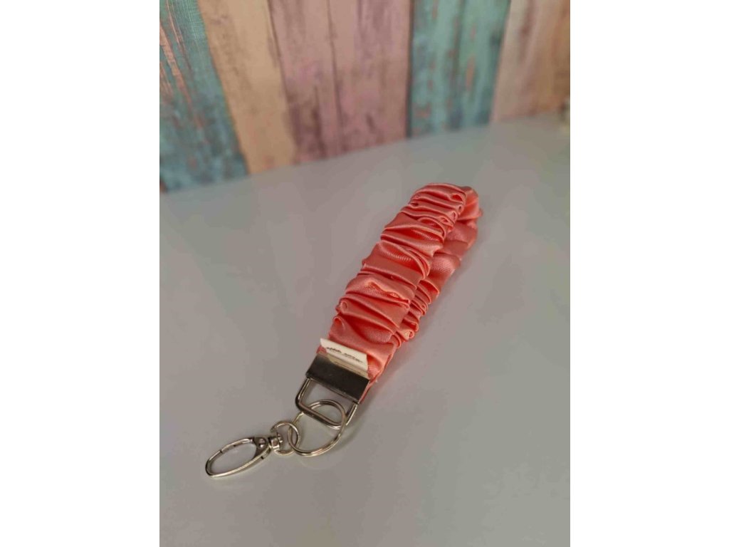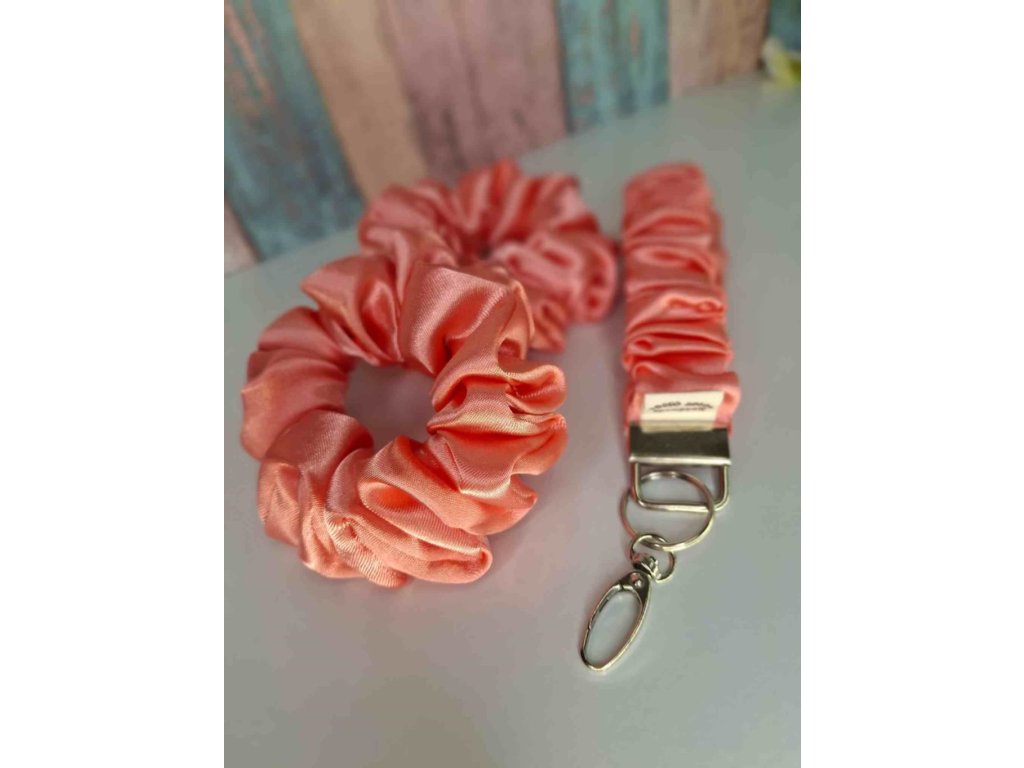 Sada obsahuje dvě saténové scrunchie doplněné o saténovou klíčenku v barvě lososová