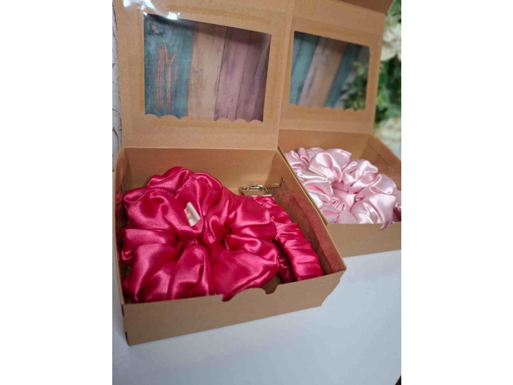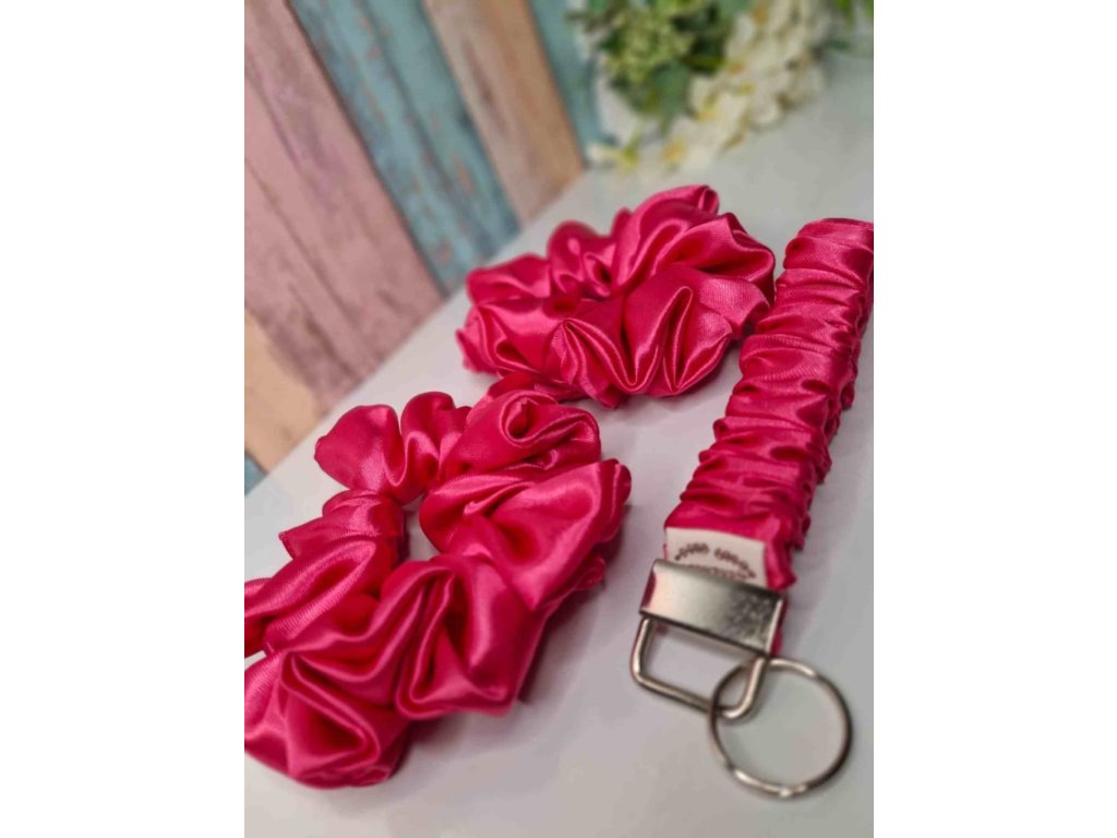 Sada obsahuje dvě saténové scrunchie doplněné o saténovou klíčenku v malinové barvě